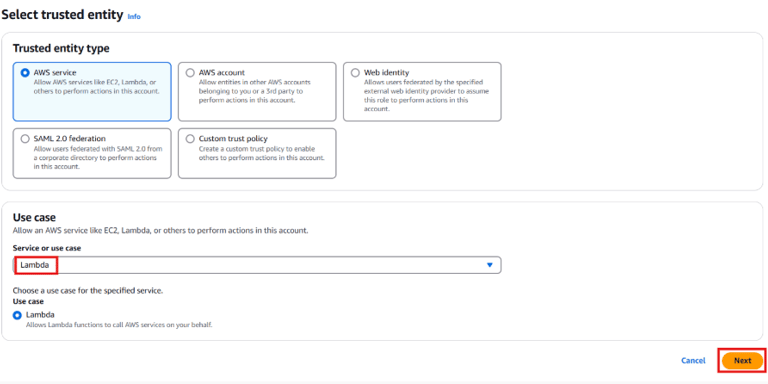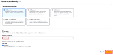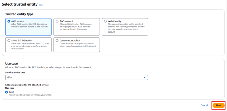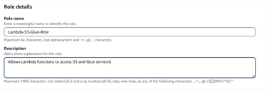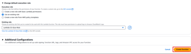 - Role: Choose Use an existing role and select the Lambda-S3-Glue-Role created earlier.