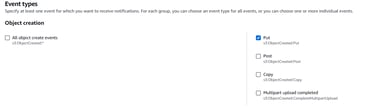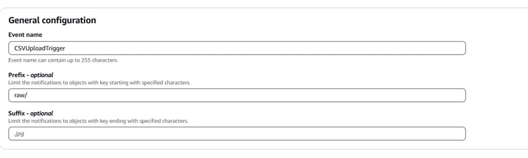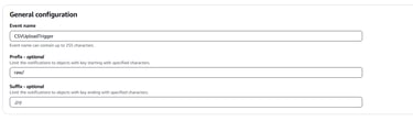 - Prefix: raw/ (All raw files are uploaded to this folder).