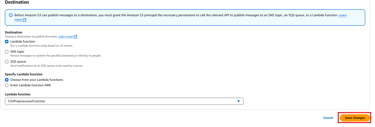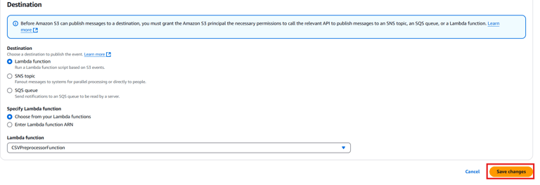 - Destination: Choose Lambda Function and select CSVPreprocessorFunction.