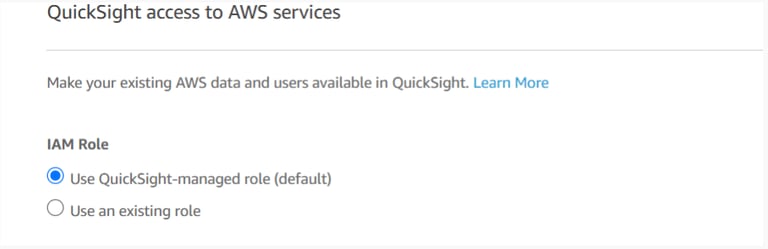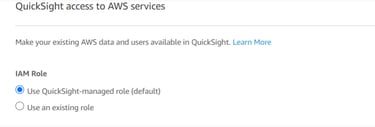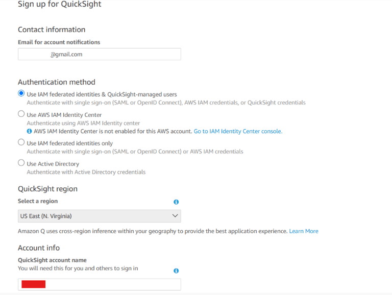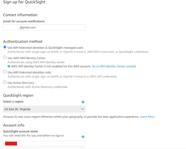Add your email. For the Authentication Method, check Use IAM federated identities & QuickSight-managed users . Choose the US-East region (Same region as your buckets).Add a QuickSight Account Name.