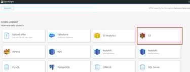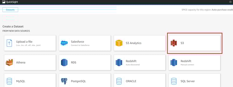 In the QuickSight console, go to the Datasets section and click New Dataset.