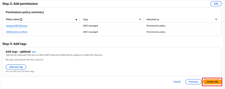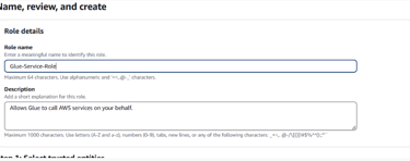 - AmazonS3FullAccessName the role Glue-Service-Role and click Create Role.
