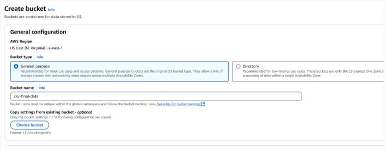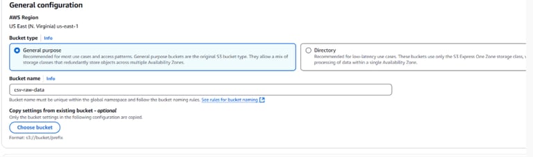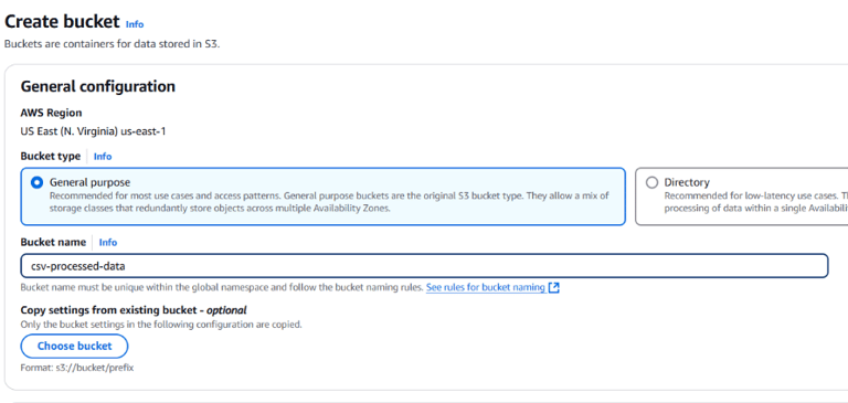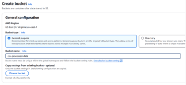 - Bucket Name: Use descriptive names like csv-raw-data for raw data , csv-processed-data for processed data and csv-final-data for final data.