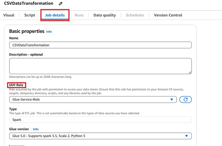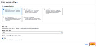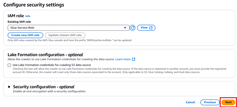 IAM Role: Select an existing Glue role with access to S3 or create a new one.