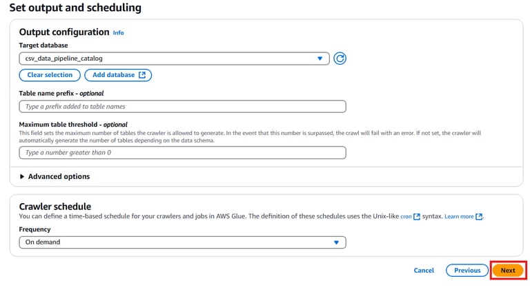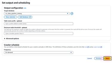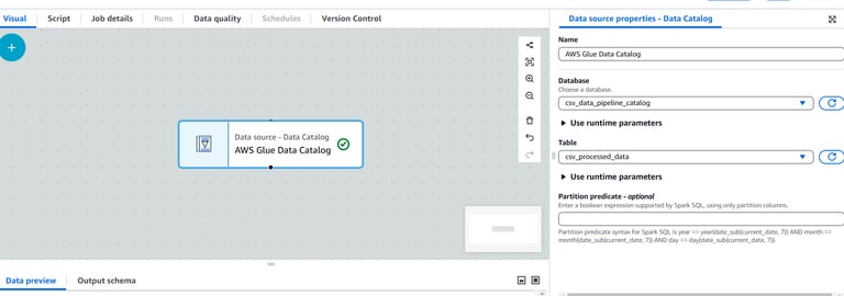 Choose the AWS Glue Data Catalog. Under the database, choose the created csv_data_pipeline_catalog database.