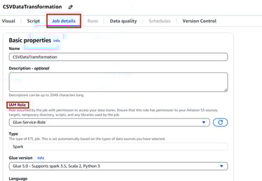 Configure Job Properties including Name, IAM Role, and Save and Run the Job