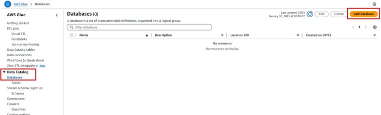 Setup an AWS Glue Data Catalog: AWS Glue is a managed ETL service used for data preparation and transformation. The Glue Data Catalog is a centralized metadata repository for datasets. To create the catalog: