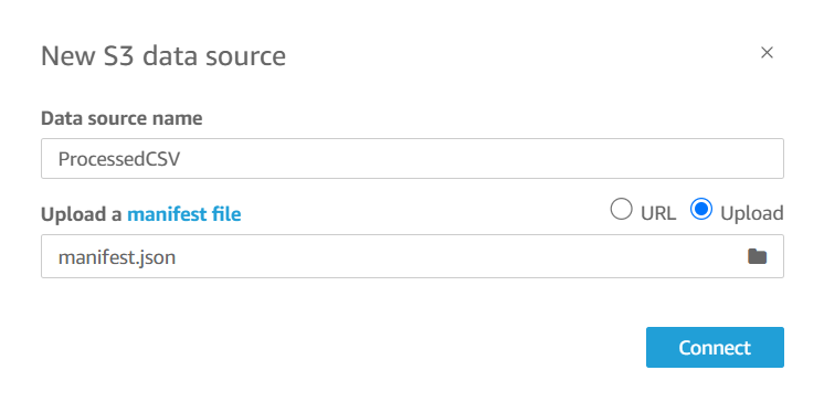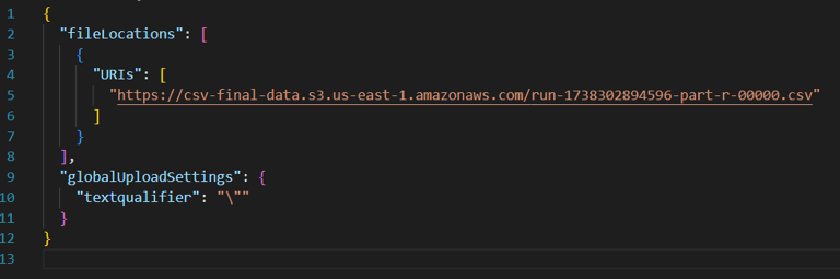 Manifest File: Create a manifest file in your local machine with the following content and upload it from your local machine. Add the Object URL you copied earlier and replace it in the placeholder.
