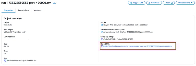 It is now ready for visualization and analytics tasks. You can click on the csv file and copy the Object URL to use it for the further steps.