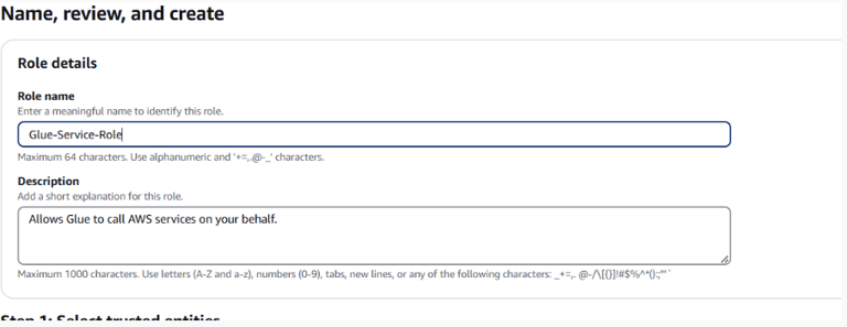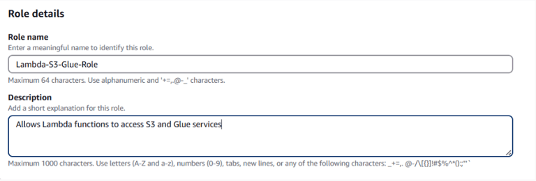 - AWSGlueServiceRoll (for Glue operations).Name the role Lambda-S3-Glue-Role and click Create Role.