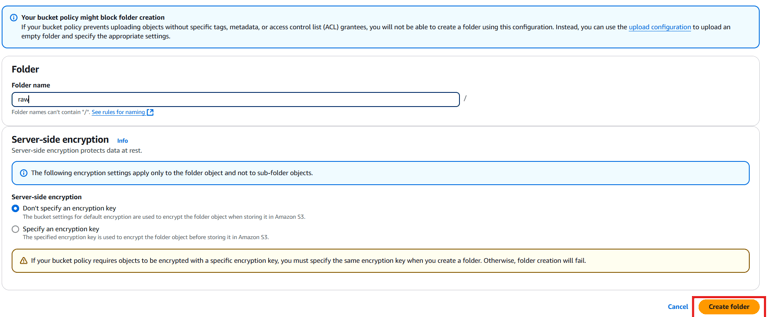💡 Tip: Keep your bucket names unique across all AWS accounts. Use a naming convention like your-project-name-raw.