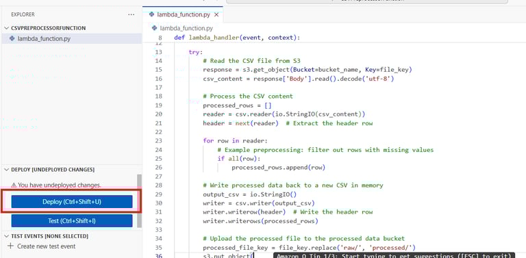 Now that we have the foundational setup, it’s time to automate the ingestion and preprocessing of CSV files. In this step, we’ll deploy a Lambda function that triggers automatically when a file is uploaded to the raw data S3 bucket